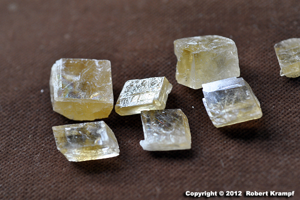 Physical properties: vitreous luster, hardness 3, white streak, three directions of cleavage forming rhombohedral shapes, fizzes in dilute hydrochloric acid.