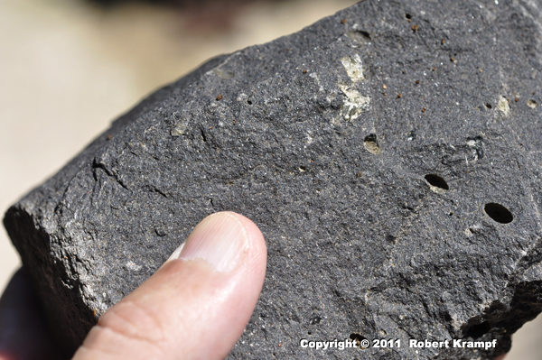 Basalt is a common extrusive rock. The individual mineral grains are almost too small to see.