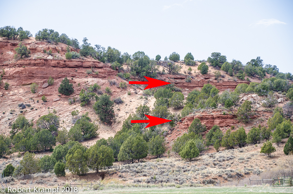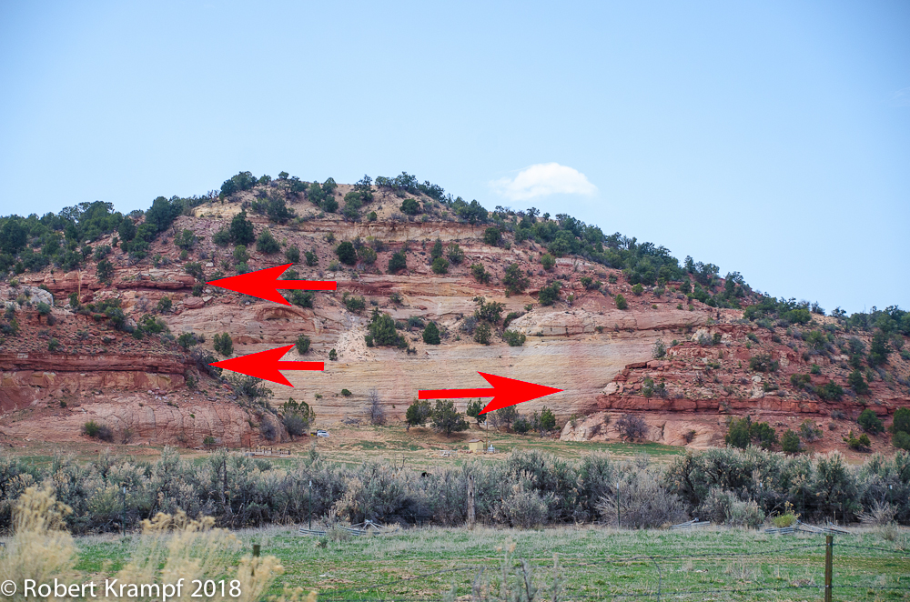 Here, I had to realign my thinking to see the fault from one side. Compare the first photo with the photo below. The red arrows point to the same layer of dark red, resistant rock. Notice that the layer is lower on the left and right, and higher in the middle. The fault is parallel to the middle cliff face, with the side towards us moving down relative to the side away from us.