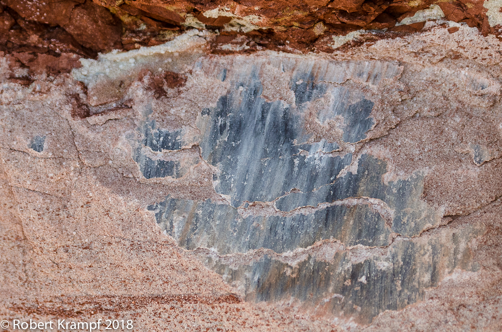 I even managed to find some slickensides, a German word for the structures formed when the two sides of a fault moved past each other. It metamorphoses the sandstone, leaving grooved quartz that indicates the direction the fault moved. In this case, the side towards the camera moved down relative to the side which has the slickensides.