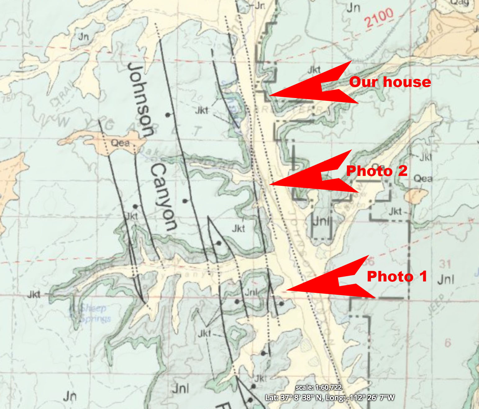 One of the interesting things that I have learned about our home in Johnson Canyon is that we live almost directly on top of an active fault zone. While there have not been any detectable earthquakes in the 5 years we have been here, there is always the chance that one will happen. As soon as I heard about the Johnson Canyon Fault Zone, I began researching, and trying to find signs of the faults. At first, I did not see them, until my mind adjusted for what I was seeing. I am used to looking at faults from the side, where you can easily see both sides of the fault, as with the photo below.