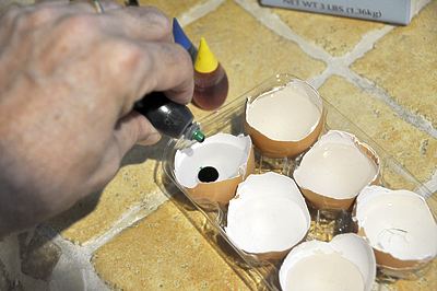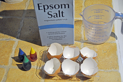 Place the egg shells in the egg carton, so they won't tip over and make a mess. Then pour the epson salt solution into the shells.