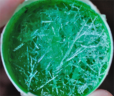 Once you have plenty of crystals, remove the egg carton from the refrigerator. There will still be liquid in the shells, which you can carefully pour into the sink. Be careful not to let the crystals fall out of the shell as you drain them. Each shell should have a mass of needle-shaped crystals inside. As they dry, they will become even more bright and shiny.