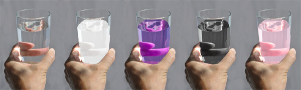 Fill another glass about half-full of water, and place it on the table beside the first. Add a drop of food coloring to the water and give the water a quick stir. Compare it with the original glass of water. It’s a different color, but is it still water? Yes. Adding a tiny amount of coloring did not change its chemical formula. It is still water. Using different colorings, you can have water that is white, purple, black, pink, or any other color. As long as you don't change the water chemically, it is still water, no matter what color it is.