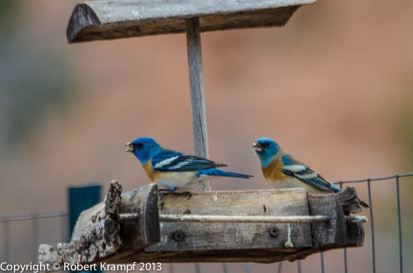 Other birds have returned too, including Lazuli Buntings (seen above), Black Headed Grosbeaks, Brown Headed Cowbirds, Western Kingbirds, and Ash Throated Flycatchers. The Goldfinches that have been here all winter have become so used to us that they don't leave the feeders unless we get within a few feet. I think that if I hung one of the nyger socks around my neck, they would be all over me in a few minutes.