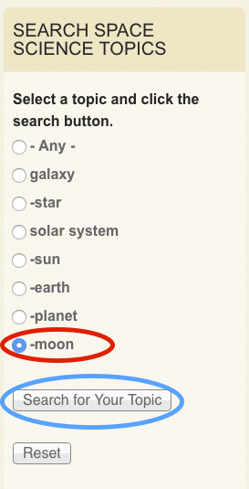 Once you get to the right Resources by Topic, look over the topics in the right hand column. This will let you narrow your search. Check the box for the topic you are interested in. For example, here I have checked the topic of "moon". Then click "Search your topic". That would show me all of the videos, experiments, and other pages that have something to do with the Moon.