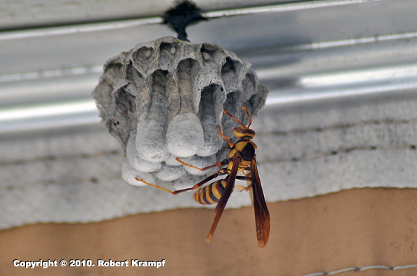 This wasp just started a nest on our porch. Why is this a good thing? (side note: Note the eggs in the top row of cells. Not part of the answer, but fun to see.)