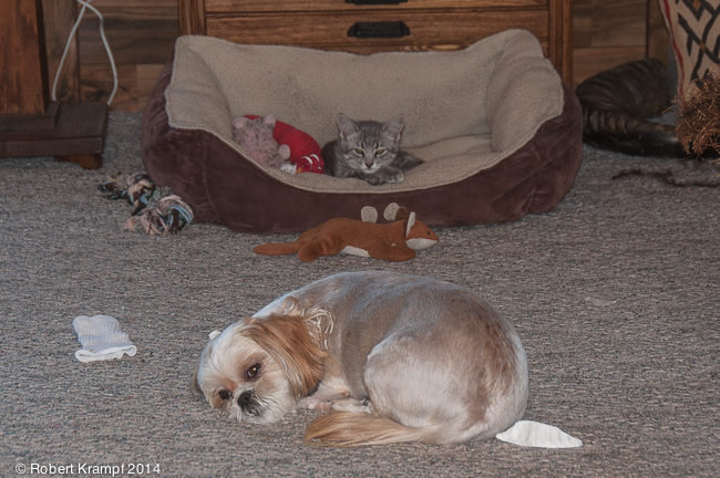 His mother was not happy being around the dog and the other cats, so we found her a new home, but Little Bit has become a very established member of the family. When he was a kitten, we started calling him Little Bit, and the name stuck. Although he is not little anymore, he is a little bit silly, a little bit crazy, a little bit pester some, and a LOT of cute.