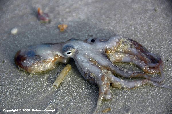An octopus has three hearts. Two of them are attached to the gills, pumping blood to collect oxygen. The third heart pumps the oxygenated blood to the rest of the body. They also have blue blood. Instead of having hemoglobin, which is red due to iron to carry oxygen, an octopus has hemocyanin, which is blue due to copper. This one was very small, so it was easy to put it back into the water, but some species, like the Pacific Octopus, can grow up to 600 pounds.