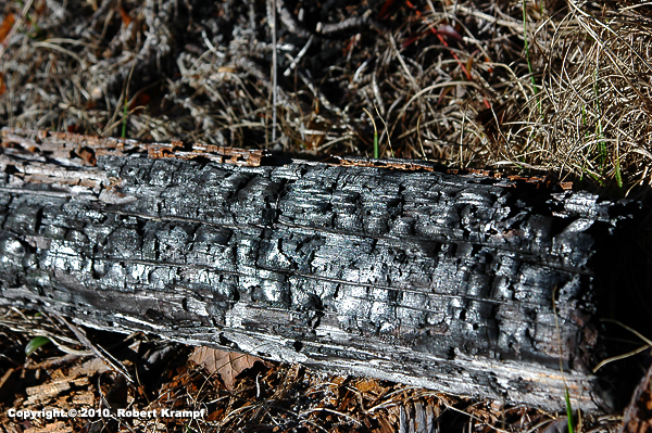 I became interested in "reading" burned trees when I visited Yellowstone after the big fires of 1988. The checked or "alligator" pattern tells us that the tree was dead and dry before the fire. The unburned side tells us that it was not an intense fire. It may have been burned during a prescribed burn, or it may be left over from someone's campfire.