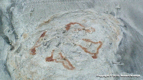 This is the remains of a dead Moon Jelly, a common type of jellyfish. Since the vast majority of their body is made up of water, very little is left behind, but the pigments that colored its internal organs still show their outline. Similar markings have been found as fossils of ancient jellyfish.