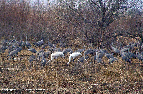 The gray birds are Sandhill Cranes, but the two white birds are Whooping Cranes. Seeing them was a rare treat! This pair is part of Operation Migration, and they learned the migration route to Florida by following an ultra-light aircraft piloted by one of the people that raised them.