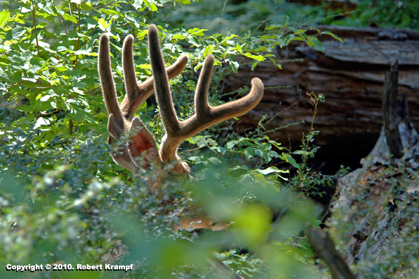 This is a buck (male deer) in the process of growing new antlers. Each year, at the end of the mating season, male deer lose their antlers. The following year, at the start of the mating season, they grow new antlers. Antlers are made of bone, and as they are growing, they are covered with a layer of fuzzy skin called velvet. The velvet has lots of blood vessels to nourish the bone as it grows. Once the antlers are fully grown, the velvet dies, and peels away. The bone of the antlers dies too, and they stay in place until the mating season is over, when they fall off.