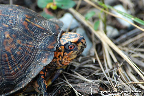 This turtle is a male. While the shape of the shell is an excellent indicator of the sex of an Eastern Box Turtle, their eyes are another way to tell males from females. Males have eyes that are red or bright orange, while females have eyes that are light brown or light orange.
