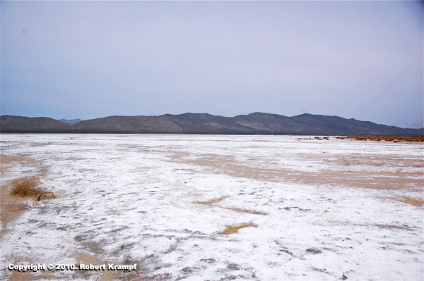 This is a photo from my day of driving through the Mojave Desert. The white stuff is not snow. What is it?