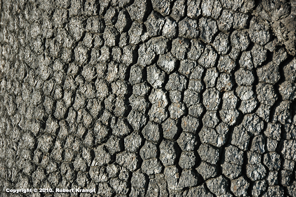 In many woody plants, the outer layer of bark is made up of dead tissue, so it does not grow. Underneath the outer bark is a layer of living tissue, which does grow. As the tree grows, its trunk gets thicker, pushing outwards on the dead layer of bark and breaking it. For some trees, such as Sycamores, the bark peels off in layers, exfoliating the old, dead tissue. For others, it cracks and continues to build up, as in this photo.