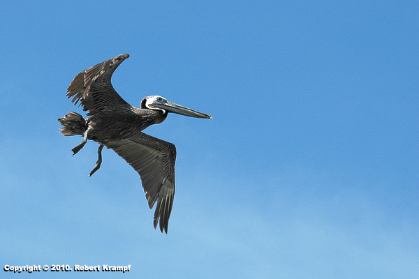 This is a Brown Pelican. Their feet are totipalmate, which means that all four of their toes are connected by webbing, instead of just having the front three toes webbed like most other water birds. The extra webbing makes them powerful swimmers.