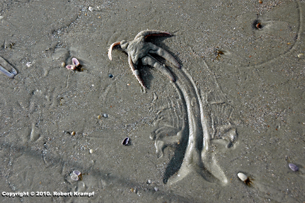 When starfish wash up on the shore, they bury themselves in the sand to protect themselves from predators and drying out. When the tide is coming back in, they dig their way out of the sand, so the waves can carry them back out. This one was waiting for the waves to reach high enough on the beach to carry it off the beach. This one has emerged, and is waiting for a wave to take it back out to sea.