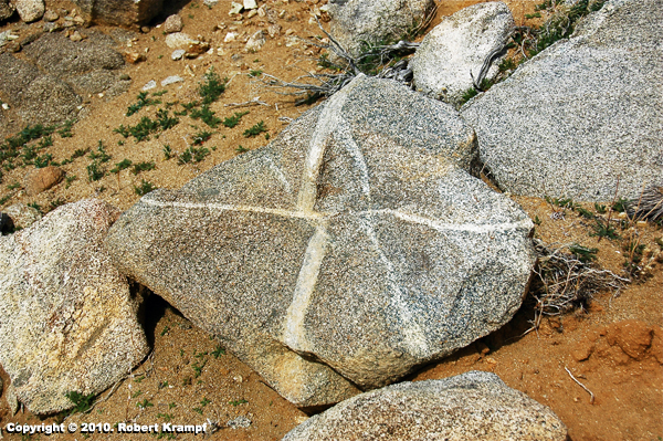I found this large rock on my recent trip to California. The three white lines are places where the rock cracked, allowing molten quartz to flow in and cool. Did they all happen at the same time? If not, what order did they occur in?