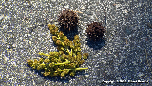 The green parts are male flowers, which produce pollen. Like many trees, Sweetgum trees are pollenated by the wind, which means that they need to produce a LOT of pollen. The round, brown structures are the fruit, which develops from the female flower. The holes in these show that they have already released their seeds.