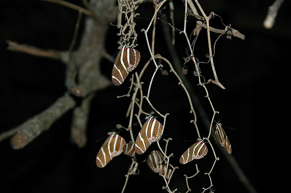 These are Zebra Longwing butterflies, the official Florida State Butterfly. These butterflies roost in groups at night, and will return to the same spot each night. I took this photo on a trail in West Palm Beach, Florida. I was walking at night, listening to Screech Owls calling, when I bumped a branch and all of the "leaves" began flying around me. The next night, I returned and photographed them.