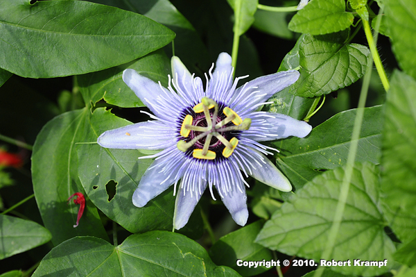 This is a Passion Flower. At first glance, it seems to have ten petals, but five of them are really sepals (the leaves around the base of the flower) pretending to be petals. If you look closely, every other "petal" has a thin, green border. Those are the sepals. On the backside, the sepals are green, while the petals are purple on both sides.