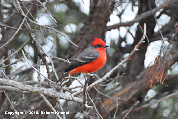 This is a male Vermillion Flycatcher. The females very different, sort of a peach-brown color. They are native to the Southwest. I was particularly happy to see this one, as it is a new bird for my life list.