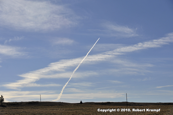 No, this is not a missile launch. This photo is an optical illusion, much like one that was in the news recently. We were firmly convinced that it was a rocket launch, until I got out my telephoto lens and got a closeup shot of the plane. Because it was flying towards us, and there was an unobstructed view to the horizon, it appeared to be going upwards instead of horizontally.