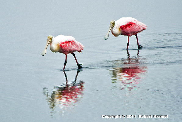 Roseate Spoonbills get the red pigment from their food, but just eating shrimp and other crustaceans is not enough. First, those crustaceans have to eat algae that contains the right pigments, in this case, alpha and beta caratenoids. The Spoonbill's liver secretes enzymes that break down the caratenoids, bonding them to fats and changing their color to bright red or orange. These pigments are then deposited in the feathers. If the Roseate Spoonbill does not get food that contains the right caratenoids, when it molts, the new feathers will be white.