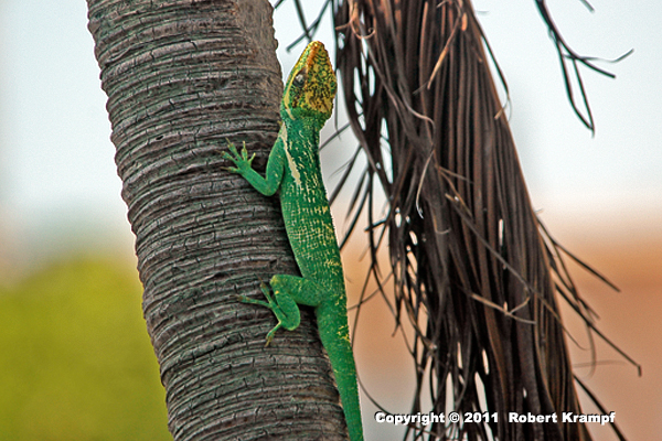 This is a Cuban Knight Anole, and as its name says, it is native to Cuba. They have been introduced to Florida as escaped pets, and are quickly dominating their habitat in South Florida. Someone asked how long a species is considered to be "invasive." Starlings were introduced in 1890, and they are still considered an invasive species. Basically, as long as an introduced species is causing problems, it is considered invasive.