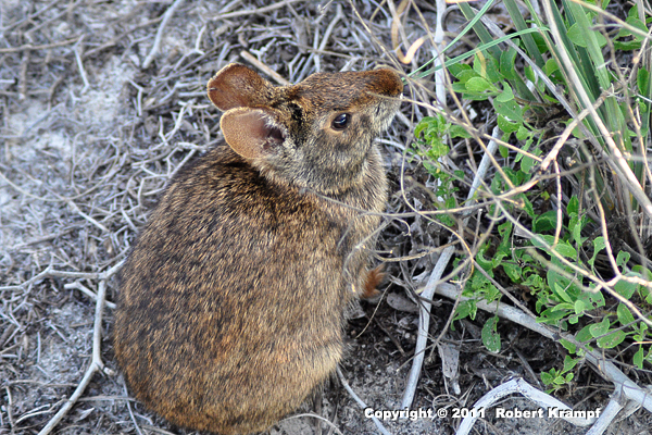 This is a Marsh Rabbit, native along the coast of Florida. They live in and around salt marshes and in the dunes at the beach. They tend to walk instead of hopping, and they spend a lot of time swimming. If they are threatened, they are likely to leap into the water and swim to safety.