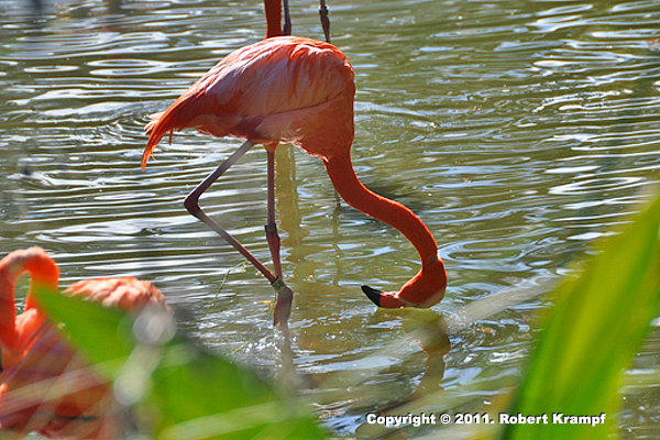 Flamingos are filter feeders, and their unique beaks help them collect algae and small crustaceans without getting too much mud. The beak us dipped into the water upside down, until just the edge is under water. The top surface of the water flows in, and is strained by tiny, hair-like projections on the inside of the beak.