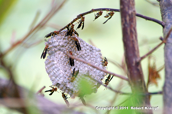 Paper Wasps have a Foundress instead of a queen. She looks like the other wasps. A nest may be started by more than one Foundress, although as the first brood begins to hatch, the dominant Foundress often drives the others away. Those that are driven away may start their own nest, or they may take over another nest, becoming the dominant female.