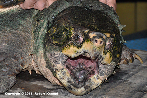 If you look closely in the dark area at the front of the mouth, you will see something that looks like an earthworm. Actually, it is the turtle's tongue. Instead of lunging at its food like a Common Snapping Turtle, the Alligator Snapping Turtle opens its mouth and wiggles its tongue. Fish swim right in to eat the "worm", and wind up being a meal for the turtle.