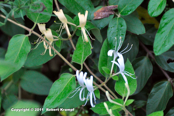 This is Japanese Honeysuckle. When the buds first open, they are white, but over time, carotene pigments cause the flowers to become yellow. It is thought that the change in color attracts a wider range of insects. As child, I spent many an afternoon enjoying the tiny sips of nectar from these flowers.