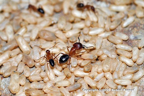 Both are Carpenter Ant workers, but the larger is a Major Worker, and the smaller is a Minor Worker. Major workers defend the nest, search for food, and move heavy objects. Minor workers tend larvae and expand the nest.