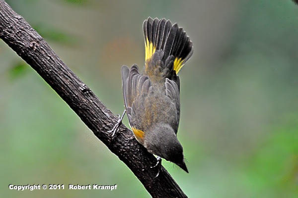 This is a female Redstart, a warbler that acts more like a flycatcher. She swoops from a perch to catch flying insects. The "whiskers" are called rictal bristles, and they are thought to aid in scooping up flying insects, and also to protect the bird's eyes from the legs of their insect prey.