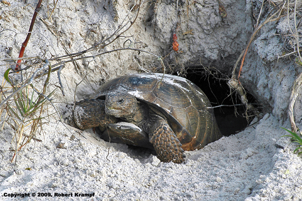 This is a Gopher Tortoise, and many animals depend on it. Gopher Tortoises dig burrows, and since they move around, they dig quite a few holes. Many creatures live in abandoned tortoise holes, and some actually move in and live with the tortoise. There are over 350 species that use Gopher Tortoise burrows. When so many organisms depend on one species, it is called a keystone species. In a stone arch, the stone at the top is the keystone. Without the keystone, the arch would collapse, and the same is true for a keystone species in the food web. If the Gopher Tortoise became extinct, many species would suffer.