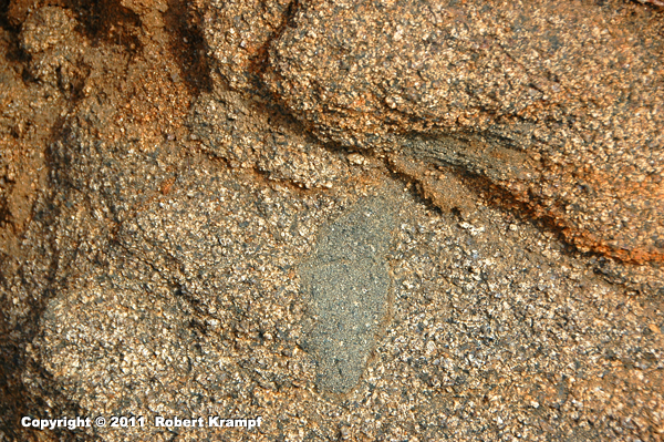 Xenolith means "foreign rock". As the magma (molten rock) melts its way through the surrounding rock, sometimes a chunk of the surrounding rock breaks away and sinks into the magma. If the magma cools before that chunk melts, it winds up as a xenolith, a chunk of rock that is not part of the igneous rock around it. You can often see these in the polished granite used on buildings.