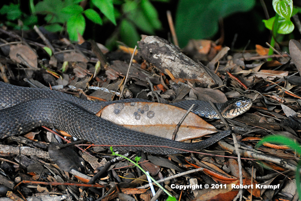 This water snake is almost ready to shed its skin. Instead of eyelids, snakes have a scale that covers each eye to protect it. As they prepare to shed, the scales separate slightly from the new scale underneath, causing the eyes to cloud. During this time, the snake has very limited vision, and is more likely to bite out of fear. This is true for "pet" snakes as well as snakes in the wild.
