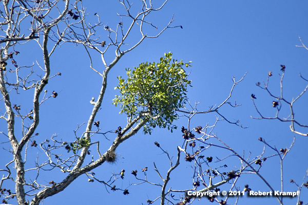 The patch of leaves is Mistletoe, a plant that is an obligate hemi-parasite. Obligate means that it must grow on another plant, and hemi-parasite means that it uses photosynthesis to produce some of its nutrients, while getting water and others from the host. Although it is a parasite, it actually helps many trees by attracting birds that spread the tree's seeds. They also spread the Mistletoe seeds, growing new Mistletoe plants.
