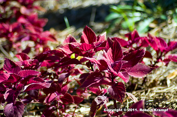 These leaves have chlorophyll, just as other leaves do. The red color comes from pigments called anthocyanins. Many plants have anthocyanins below their chlorophyll, causing their leaves to turn red in the autumn as the chlorophyll goes away. Other plants, like this red Coleus, have anthocyanins above the chlorophyll, so they appear red all the time.