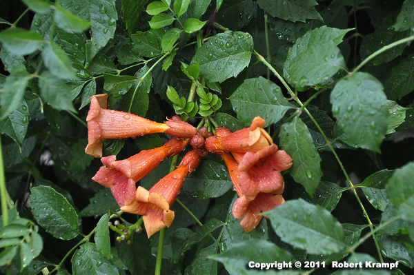This is a Trumpet Creeper (Campsis radicans), which is also known as a Cow Itch Vine. It gets that name because it causes an itchy rash on cows, much as poison ivy does for humans.