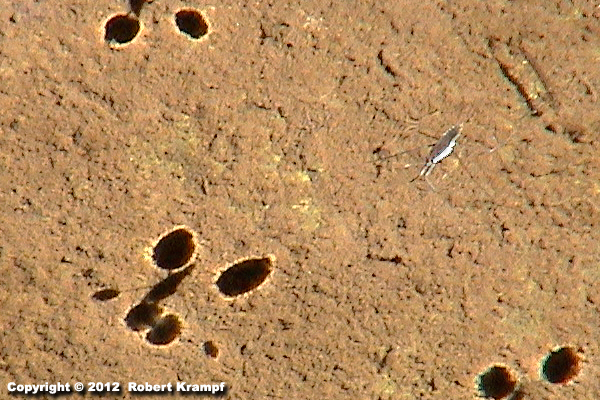 The depressions caused by the insects' feet refracts the light outwards, giving you dark spots with a bright ring around each one. Because they are caused by refraction, not something blocking the light, they are technically not shadows. Instead, they are called caustics. You can also see true shadows where the light is blocked by the insect's body, and you will notice that those are not surrounded by a circle of light. That circle of light around what looks like a shadow is a clue that you are actually seeing a caustic.