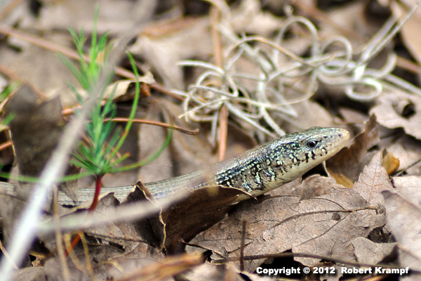 This is a Glass Lizard. It has no legs, which causes many people to think it is a snake. OK, so it if does not have legs, why is it not a snake? First, it has eyelids, which snakes do not. A snake's eyes are always open. The Glass Lizard also has external ears, the tiny opening behind the eye. Snakes do not have ear openings. If you looked at its belly, you would see another difference. Snakes have broad belly scales that reach all the way across, while Glass Lizards have many tiny belly scales. Glass lizards also have a much denser skull than a snake, much more like that of a skink.