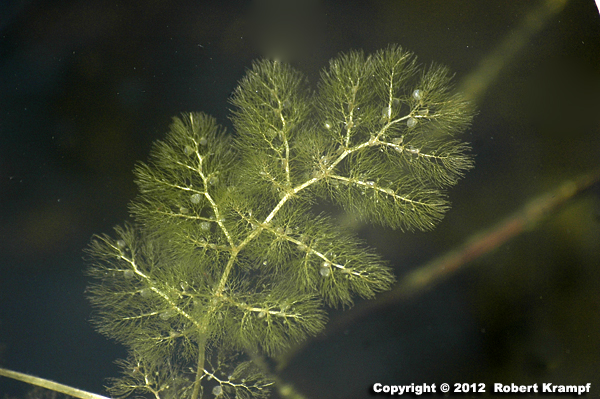 This plant is called Utricularia, also known as Bladderwort. Like the Sundew and the Venus Flytrap, Bladderworts are carnivorous plants. They trap insects and other small creatures as a source of nutrients (NOT energy!) The tiny, round bladders are the traps. Each bladder has a flap that opens and closes. When the flap is closed, the plant produces a low pressure inside the bladder. When something brushes the flap, it opens. The higher pressure of the surrounding water pushes water and whatever touched the flap into the bladder. Then the flap closes and the creature is trapped. The whole process takes less than 1/100 of a second. The trapped insects are source of nitrogen for the plant.