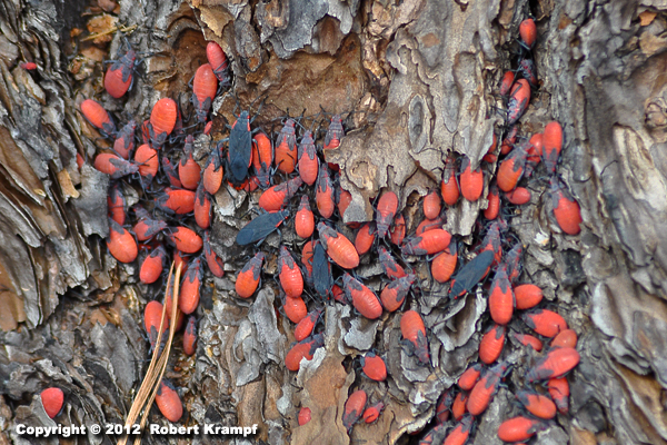 These are Soapberry Bugs (Jadera haematoloma). They are found across the southern United States, and related species are found in many other parts of the world. They specialize in drinking the juice from developing seeds of plants that are in the Soapberry family (Sapindaceae). In North American, that includes the soapberry tree, the serjania vine, and the balloon vine. It also includes other introduced species from the Soapberry family, including the round-podded golden raintree, the flat-podded golden raintree, the heartseed vine, and other related plants.