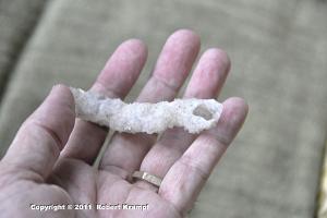 This is part of the home of a marine worm called Dioptra cuprea, sometimes known as a Plumed Worm. They are found on beaches from Massachusetts to the Gulf of Mexico, and related worms are found in many other parts of the world. These carnivorous worms secrete mucus to glue together sand, bits of shell, and other debris to make a tube that they live in. As beach sand shifts, the top of the tube can be broken away, letting people find these strong, flexible chains of shell bits.