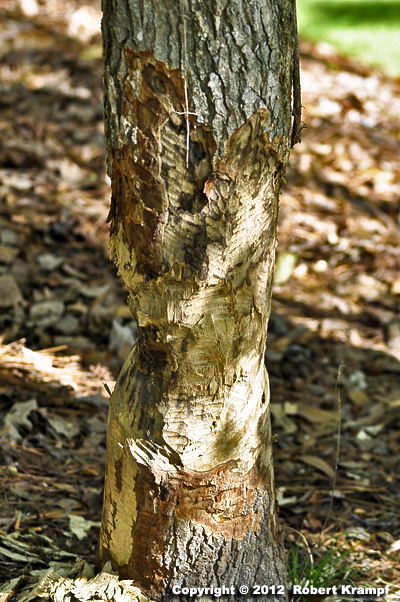 Well, they eat parts of trees, but not the wood. If you look at the base of the tree, you will see a pile of wood chips. The beaver was working to cut down the tree to use it for construction of a lodge to live in, or a dam on the nearby creek. Those wood chips show that the beaver was not eating the wood.