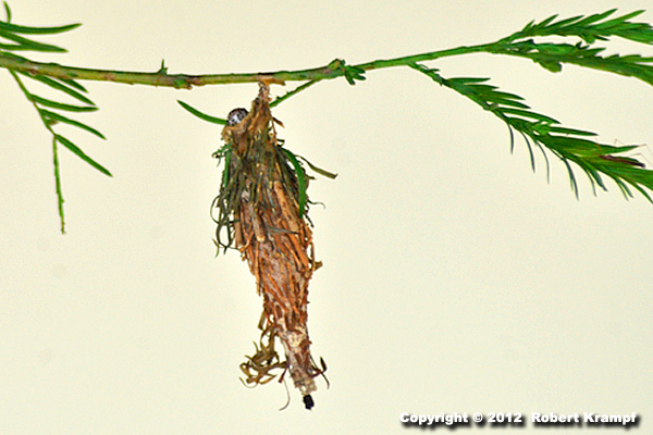 This is the larva of a Bagworm Moth. Different species are common around the world. The caterpillar spins a "bag" of strong silk decorated with bits of plant material. The bag serves as protection, camouflage, and later, as a protective covering for the pupa. While some species weaken their host tree, many are fairly harmless to their host trees. The adult males are good fliers, but are unable to eat, so they die after mating. The adult females of most species lack wings, and some never emerge from their bag. Instead, they lay their eggs inside the bag, which protects them over the winter.